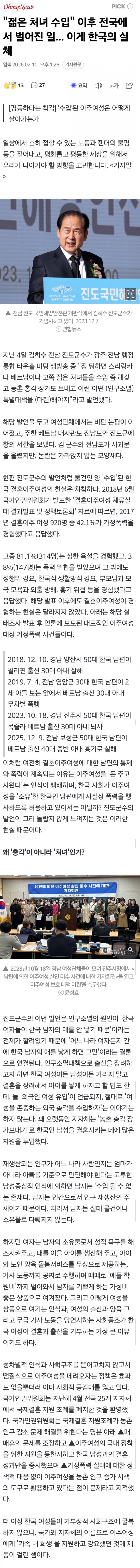 팩트가 뭐겠냐.... 젊은 처녀는 싹싹하고 순종적이고 조신하고 겸손하고 집안일 내조만 잘하면 땡인데 젊은 총각은 유학생 빼면 외노자잖아..... 이미 능력 있는 자기 나라에서 자리 잡은 청년이 자기 자리 버리고 외국까지 올리는 없을 거고 ㅋㅋㅋㅋㅋㅋㅋㅋ