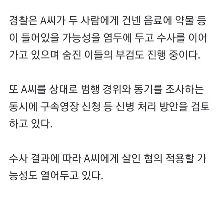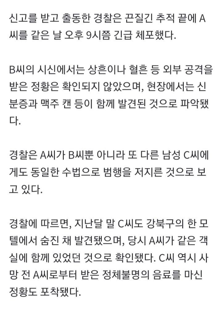 내용보면 지난달에도 한명 죽이고, 또 다른 한명은 똑같은 방법으로 죽을뻔하다 살아났다는거 같은데세번째 피해자가 생겨야 겨우 체포하네 진짜 경찰ㅋㅋㅋㅋㅋ