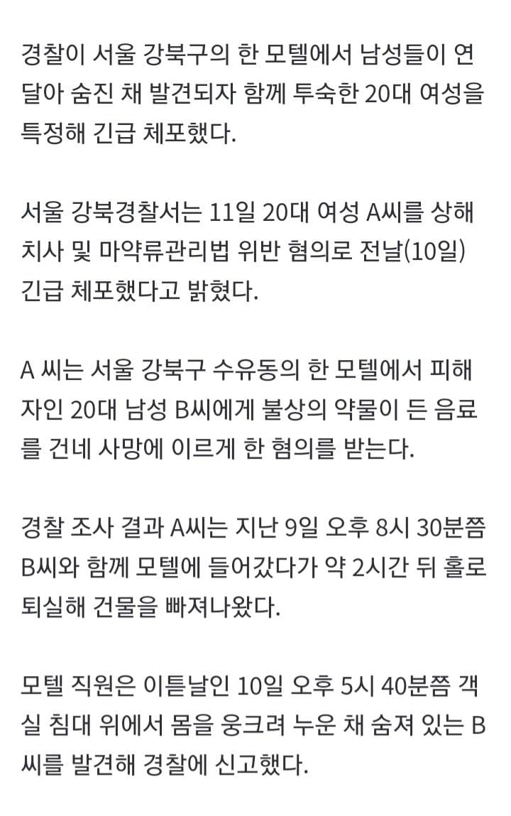 서울 강북 모텔서 남성들 잇단 의문사…20대 女 긴급체포