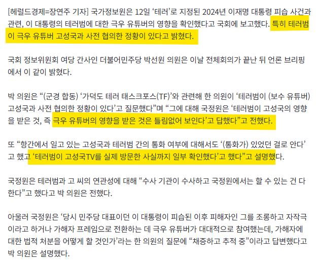 “국정원, 李대통령 테러범에 극우 유튜버 고성국 영향 확인”