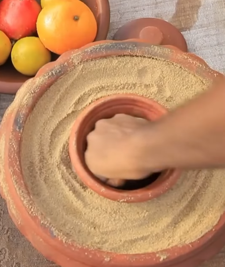 우선 큰 항아리(드럼통) 안에 작은 항아리를 넣고 그 틈새에 모래를 채운다.