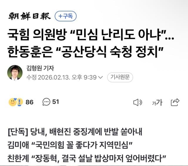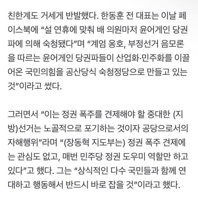 국힘 의원방 “민심 난리도 아냐”... 한동훈은 “공산당식 숙청 정치”