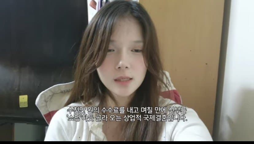 동남아 여성들이 얼마나 간절하고 절박한지는 모르면서 매매혼이라고 손가락질 하는 잣대가 너무 역겹네. 그녀들이 노예시장에 팔려온 노예가 아니라 자발적으로 결혼을 목적으로 업체에 온 한명의 예비신부임을 알아야된다. 저여자가 지적하는 국적 취득을 위한 위장결혼 사례도 부작용은 맞지만, 배우자의 재산을 노린 국내혼인 또한 많은 사례가 있음을 알아야한다