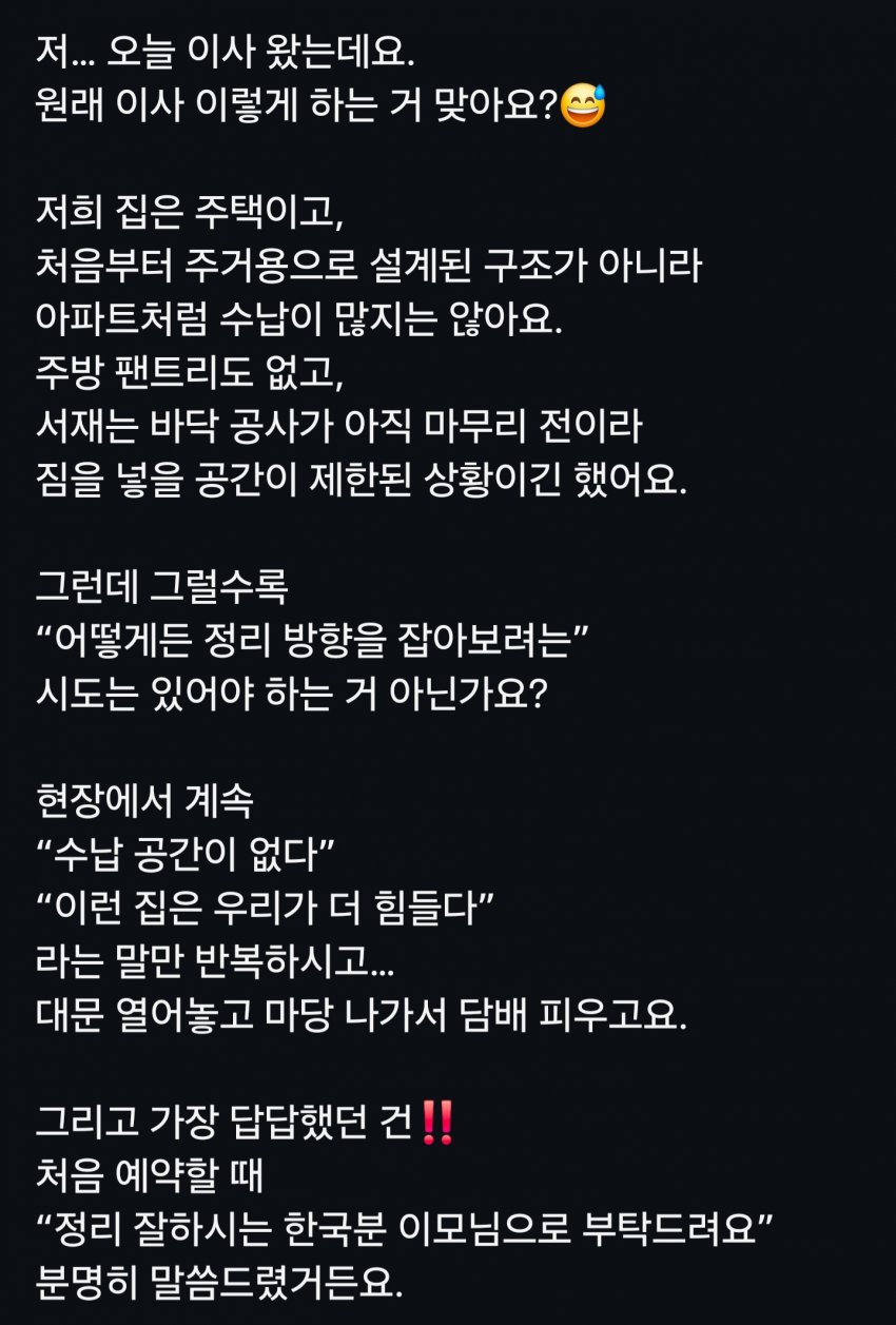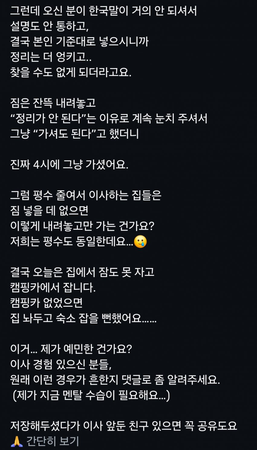 만약에 업체 말대로 정말로 수납공간이 부족한거면 집주인이 이상한거 아님? 큰데 살다가 작은데로 옮겨가면 당연히 물건들 처분하거나 버리고 이사가야지
