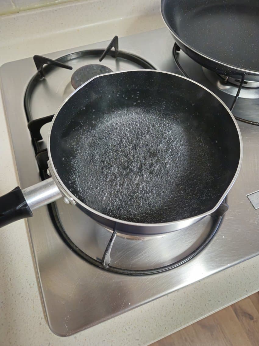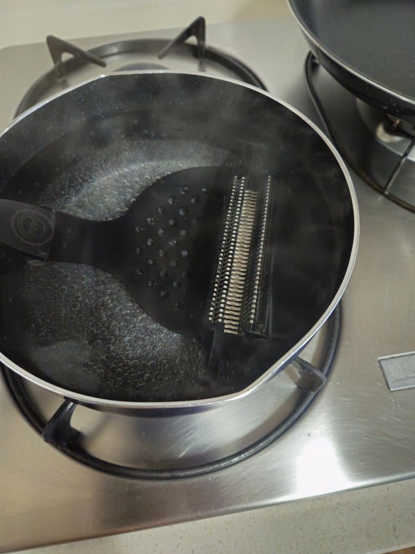 나도 찾아보고 어처구니가 없어서 여러번 조사했는데, 냄비 바닥에 안닿게 5분간 끓는물에 끓여주고 식힌다음 5분 다시 끓이고. 총 10분을 보글보글 끓여서 식히면 이물질이 싹 날아가면서 깨끗해진다고 한다. 바닥 닿아도 상관없고 30분 끓이라는 사람도 있던데 못믿겠음.