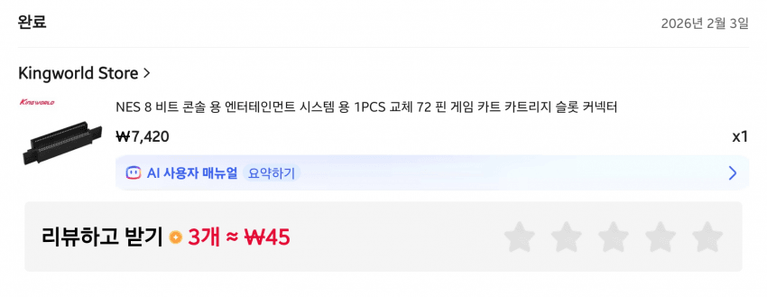 그래서 지난번에 쭝궈산 72핀 커넥터를 구입했고, NES는 잘 작동하긴 하는데... 게임이 들어가는게 어째 부드럽질 않고 뻑뻑하다. 게임 하려면 본체 잡고 힘껏 카트리지를 넣거나 잡아뽑아야 한다. 어찌나 세게 카트리지를 잡는지 본체가 덜컹거림.