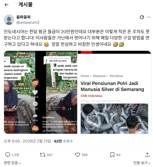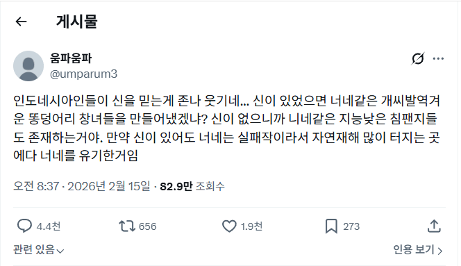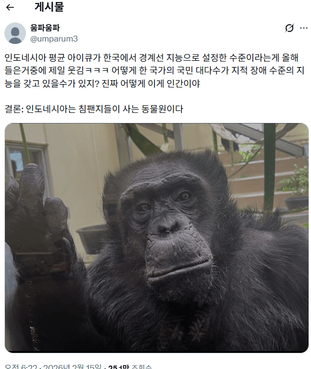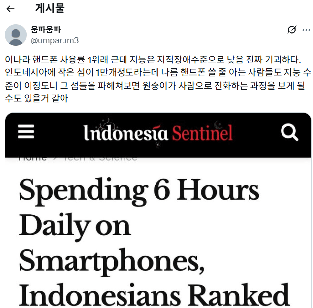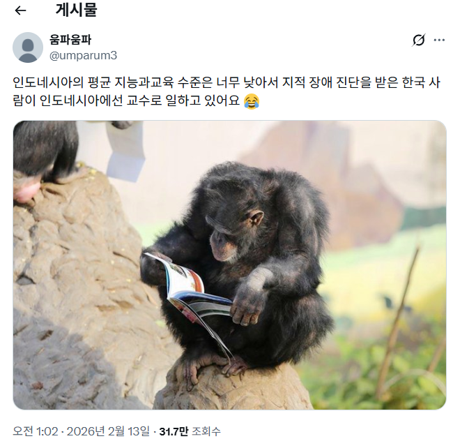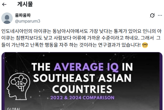 지능 비교, 서열질, 교수라는 사회적 지위와 그걸 조롱으로 사용하는 맥락까지 전형적인 한국인이다. 한국과 인도네시아의 교수 지위는 다르다. 명예는 있지만 처우가 열악해서, 한국의 교수처럼 놓고 보려면 해외로 나간 학자를 언급해야 적절하다. 일하고 있다는 표현도 인도네시아 사람이 작성했다 생각하기 어색하다.