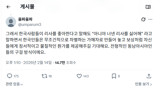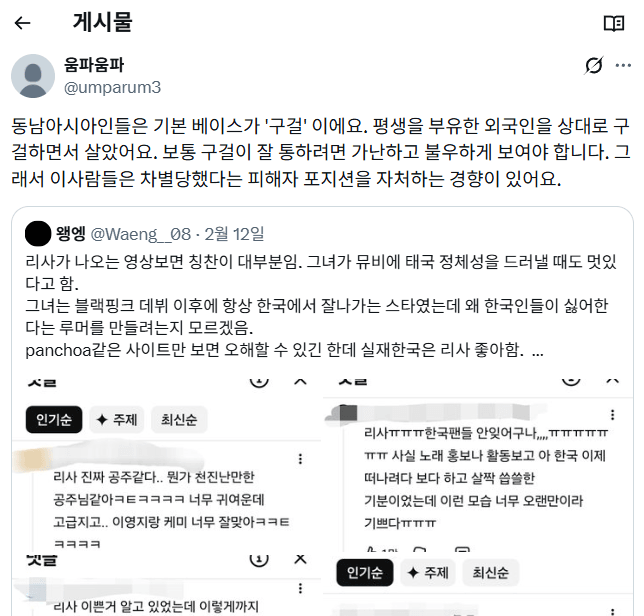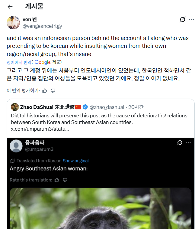시작부터 동남아 여성에게 긁혀 발생했으므로 당연하다. 한국 인터넷에서 흔히 봤던, 천박하고 표독한 인종차별주의자 한국 페미니스트다. 이번 사태에서 거의 최초로 보이는 인물을 제외하더라도, 퍼나르고 공감한 숫자를 보라. 동의하며 선동하는 한국 페미니스트 계정이 끝도 없다. 당연히 이전부터 한국 인터넷에서 보이던 자들이다. 하나같이 피해망상에 시달리는 페미니스트였지.