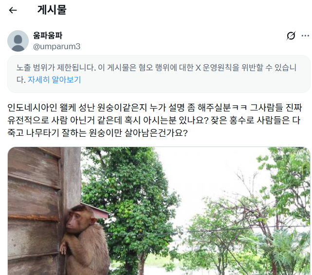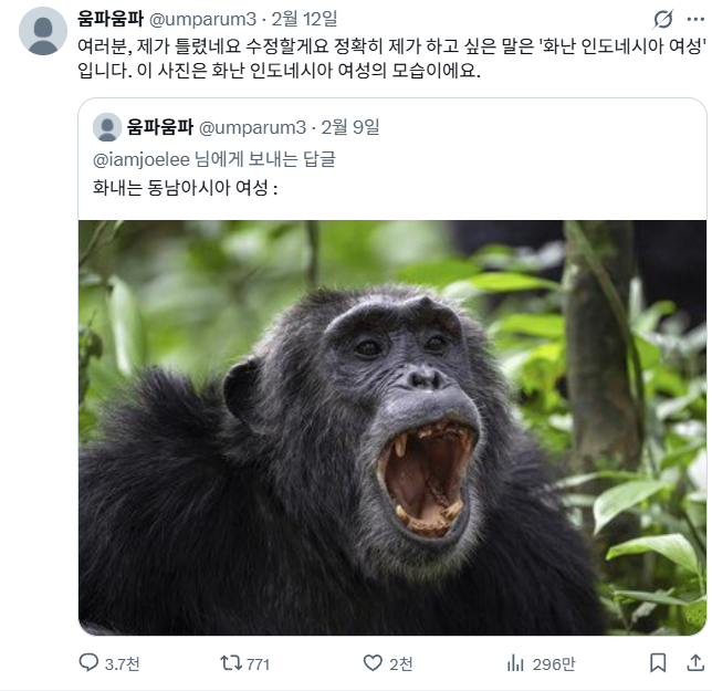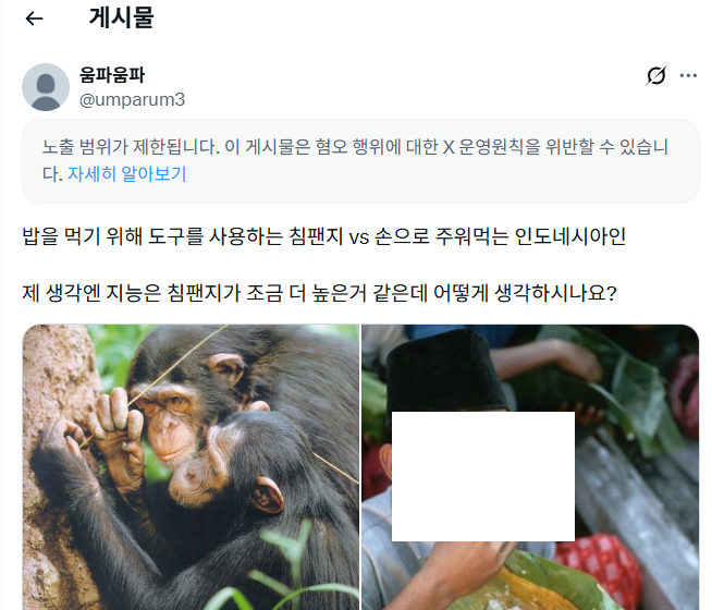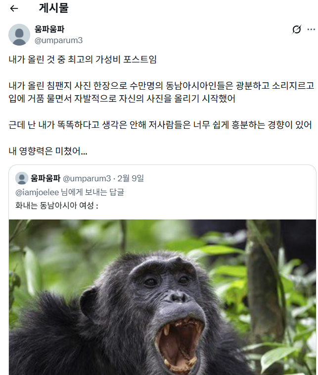 '미개'도 한국 인터넷, 특히 인종차별적 한국인이 주로 사용하는 것. 사용된 이미지도 점점 익숙해진다. 한국 국뽕과 페미니스트들이 꾸준히 사용하던 밈이 보인다. 개미알밥, 미개, 원숭이, 침팬지. 아무리 봐도 주갤 침공하던 평균적인 페미노괴로 보인다.