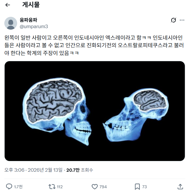 문장이 길고 연결이 비효율적이다. 한글 특유의 변주와 압축률이 아니라면 구사하기 어려운 형태다. 번역기나 AI로 했다면 쉼표가 들어가거나 '진화 이전'으로 깔끔하게 정리된다. 오스트랄로피테쿠스는 한국 교과 과정에서 거의 단독이라 할 만큼 강조되는 고인류다. 인도네시아라면 자바인(호모 에렉투스)나 메칸트로푸스가 먼저 떠오르며, 종교와 과학을 같은 비중으로 강조하는 인도네시아 교육 특성을 고려하면 나오기 힘든 조롱이다. 단순히 종교적으로 방어하면 타격이 없으니까.