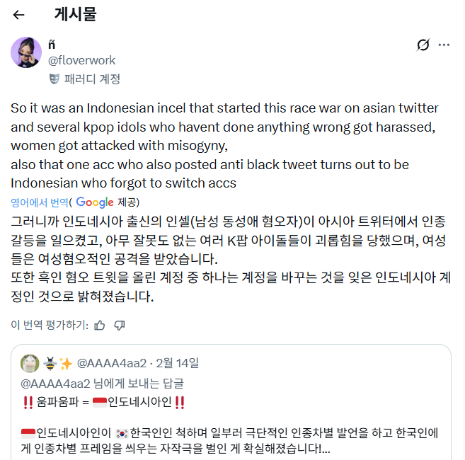 아무리 봐도 나거한 페미니스트인데, 인도네시아 남성이 번역기 돌리거나 AI를 사용해 번역했다며 이간질 중이다.
