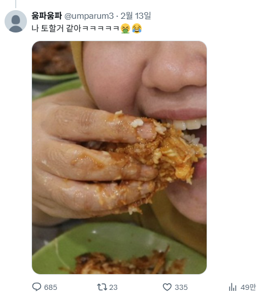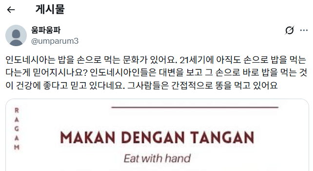토 역시 전형적인 한국식 표현. 외국에선 '역겹다', '매스껍다', '속이 좋지 않다'가 일반적이다. 특히 손으로 먹는 걸 조롱하는 건, 과거 개도국 시절 한국이 쌈과 개고기에 대해 조롱 받아 형성된 관점이다. 차라리 프랑스인이 했다면 모를까, 저건 인도네시아 사람이 작성했다 생각하기 어렵다.