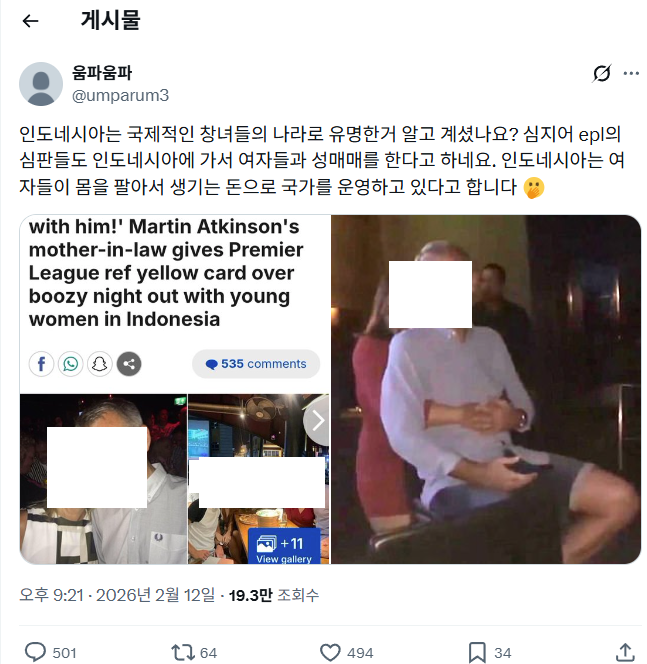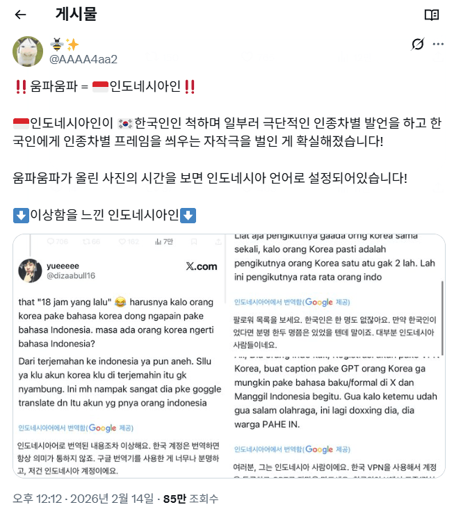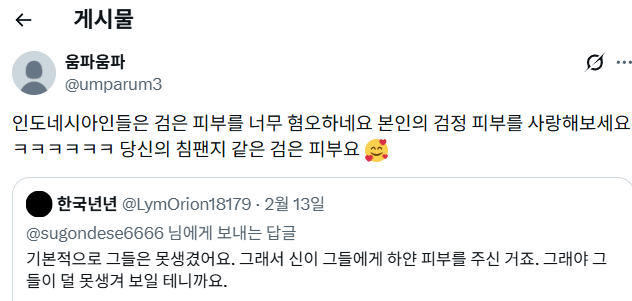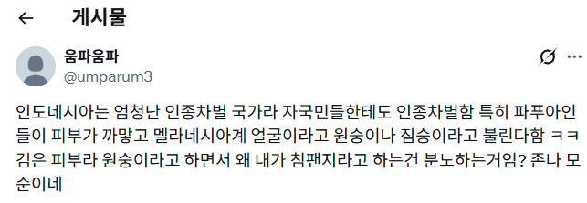 딱 봐도 나거한 트페미 같은 것들이인종차별은 인도네시아 남성 소행으로밝혀졌다, 확정이다 운운하며 리트윗.