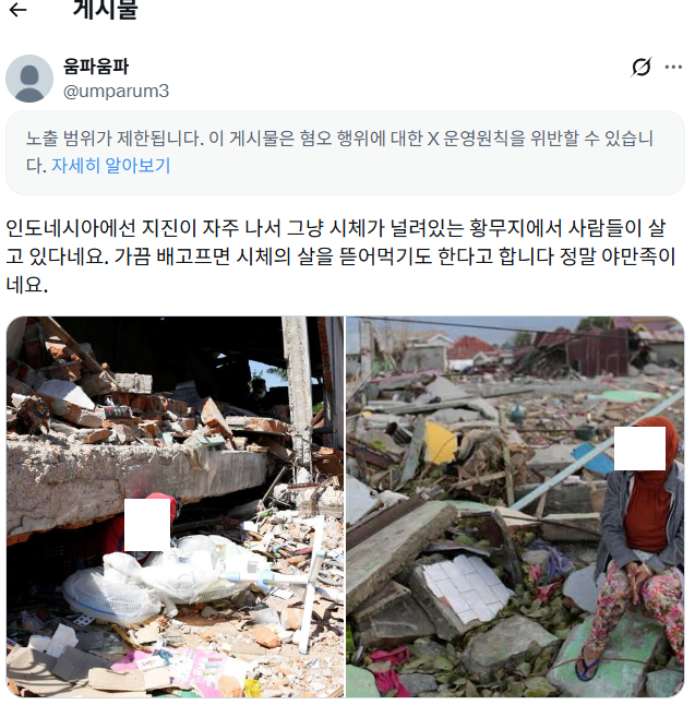 지진이 나서 건물이 붕괴한 상황을 황무지로 묘사하는 것도 어색함. '시체가 널려있는 황무지'도 한국에서 흔히 보이는 표현이다. 이걸 비참하고 낮은 느낌으로 구성하는 한국인이나 가능한 문장. 인도네시아 사람이라면 '전염병이 도는 습지'라 했겠지.