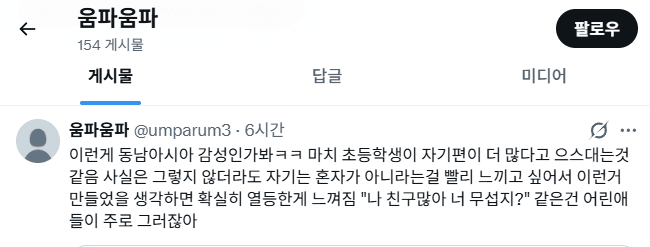 "나 친구 많아 너 무섭지?"와 같은 기싸움은 전형적인 한국 페미니스트가 보이는 생각이자 행동 양식이다. 자신이 가진 사고방식을 타인에게 투사하는 것.