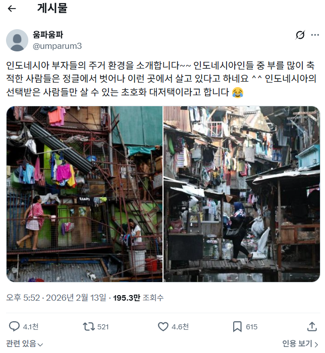 주거에 대한 높은 기준과 집착 역시 한국인이 보이는 양상이다. '초호화 대저택'이란 단어도 번역기나 AI로 나오기 어려우며, 인도네시아 주거를 전혀 이해하지 못한 관점임. 글에서 작성자의 사고와 세계관이 투명하게 드러난다.