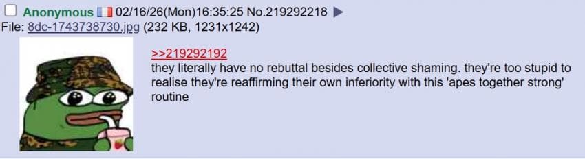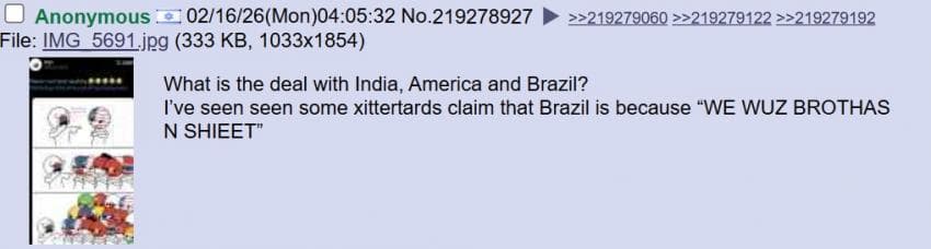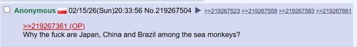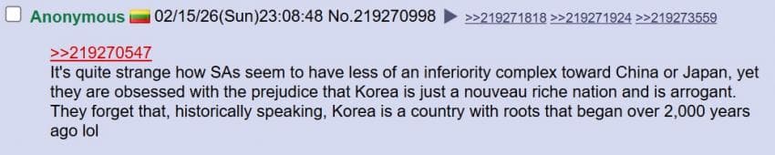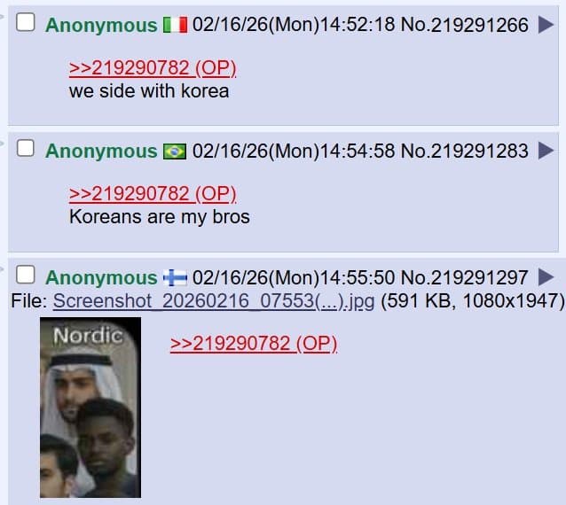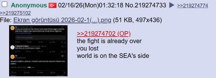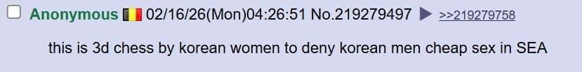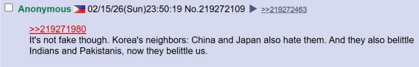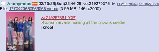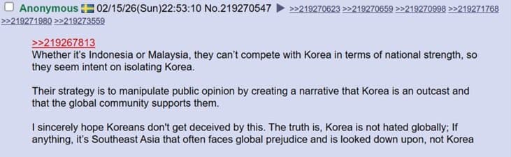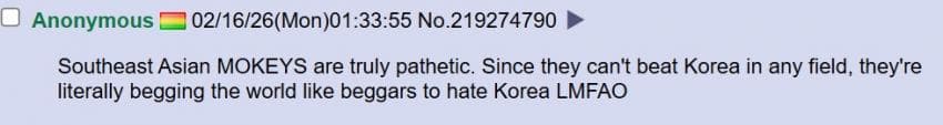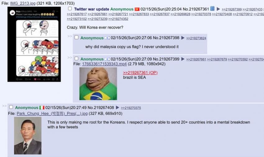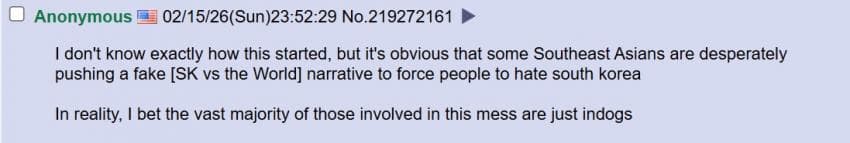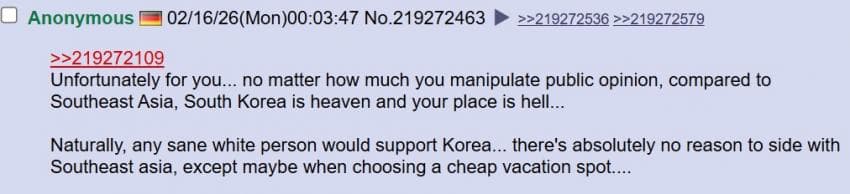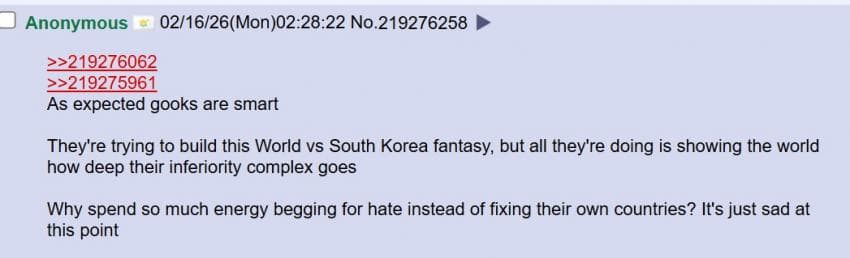 미국 4chan 성님: 트위터는 참 놀랍네. 자기 속 마음을 전 세계에 보여주잖아. 아이러니한건 한국 페미니스트들이 동남아시아 사람들을 '제 3세계'라고 부르며 평균 소득을 비웃고 있다는거야. 말 그대로 세계 최고 수준의 경제를 가진 국가를 세운건 한국 남자들이잖아? 왜 한국 여자들이 한국 남성들의 업적에 편승하는거야?