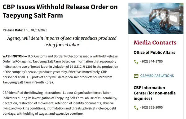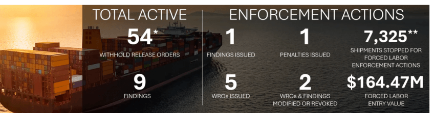 강제노동으로 만들어진 모든 상품에 미국 세관국경보호청은 통관 보류 명령(Withold Release Orders, WRO)를 내릴 수 있음. 아래는 예시