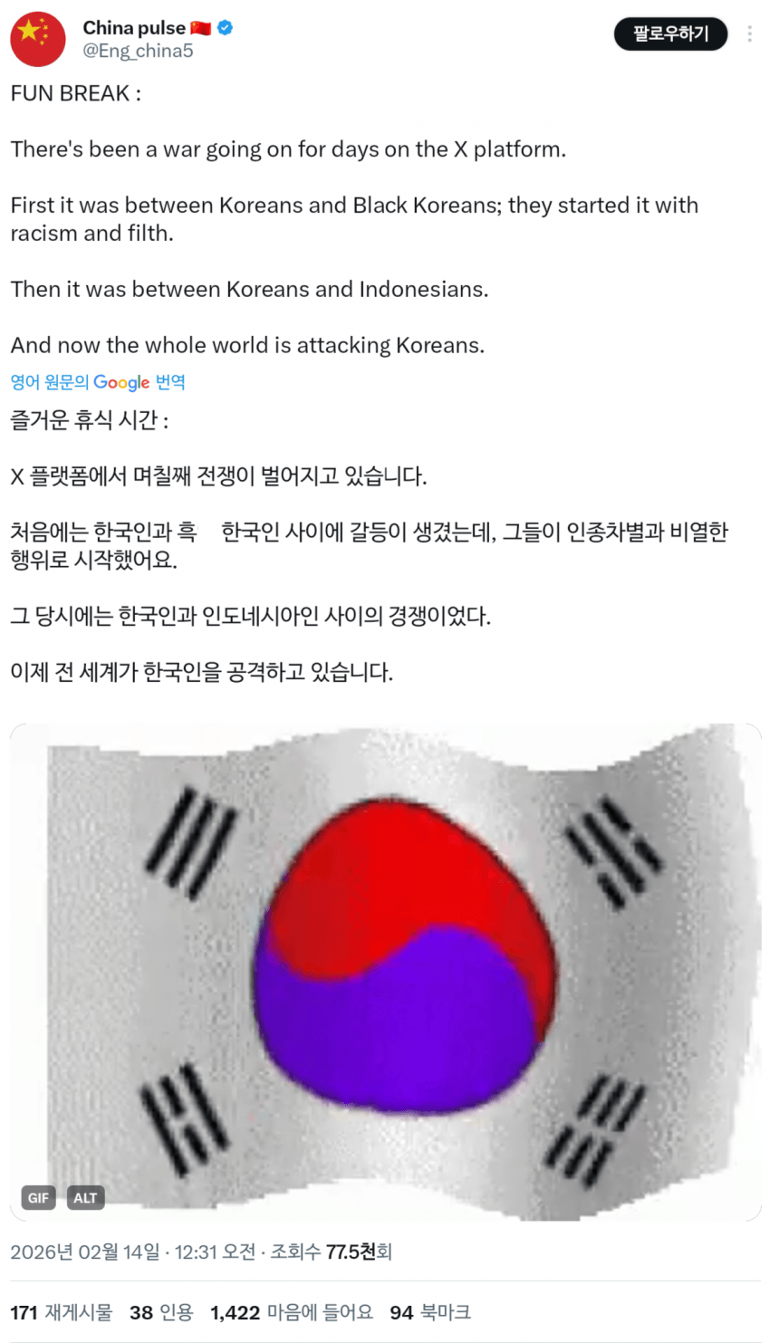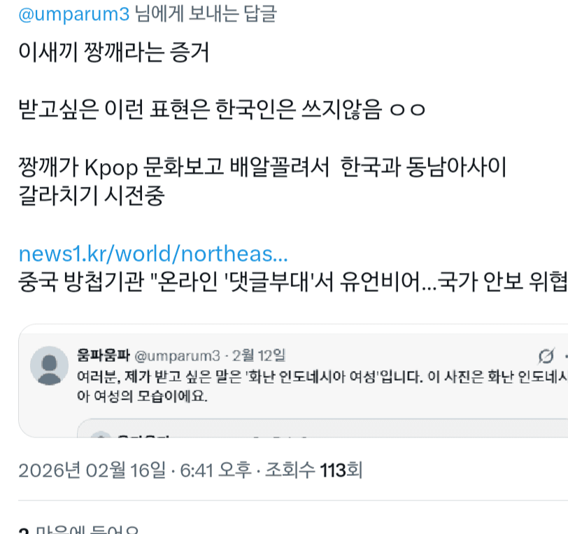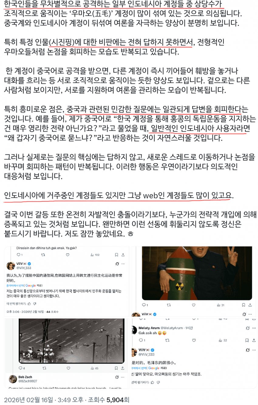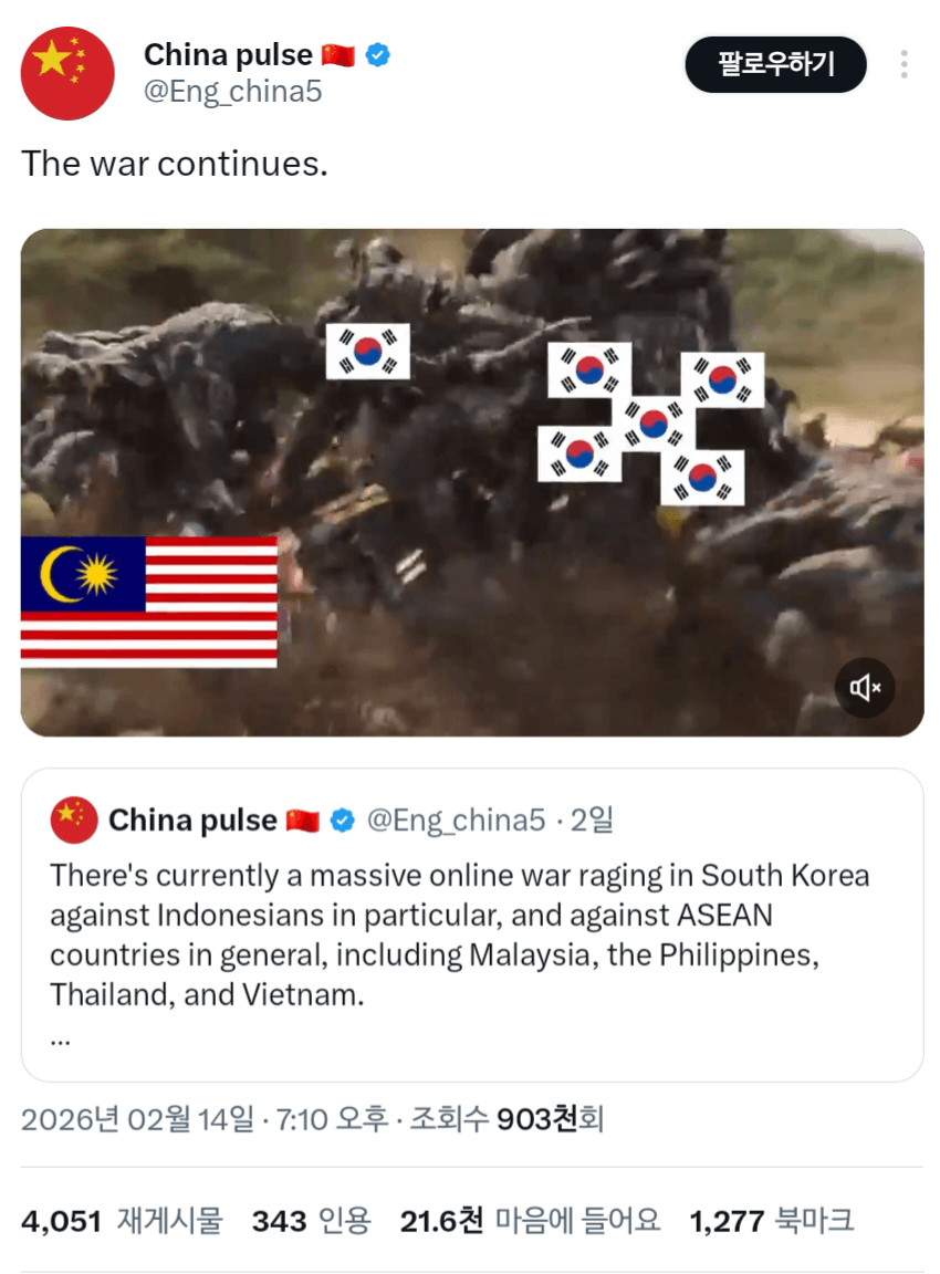 싸움 부추기는 글을 수차례 게시하고 또 재게시하는 중국 계정