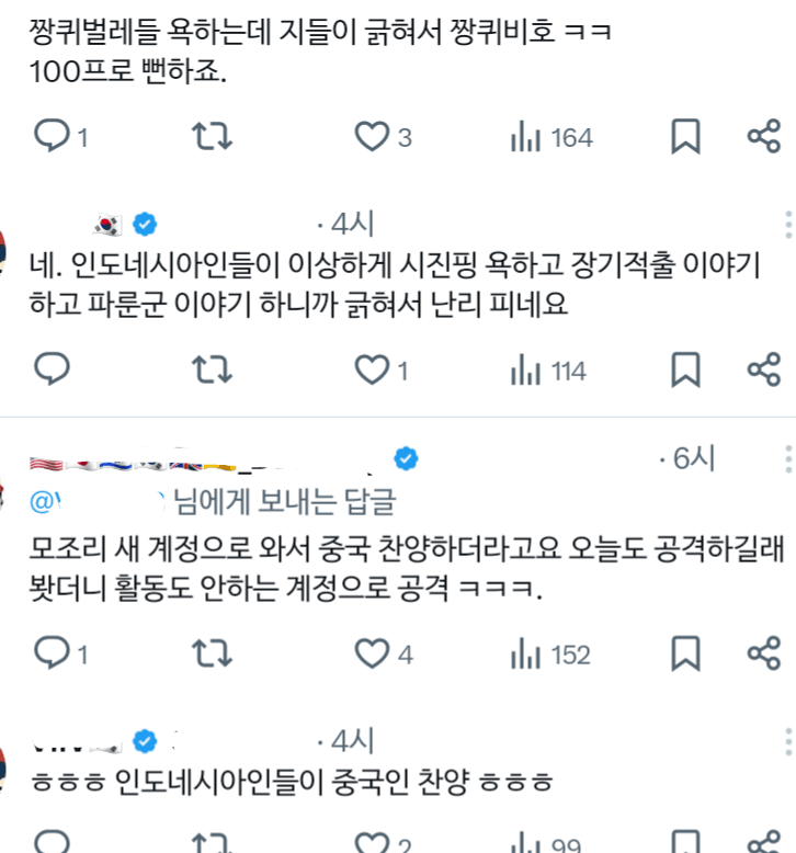 동남아 언어로 혐한을 하다가 중국 천안문이 나오니 조용해지는 자칭 동남아인들