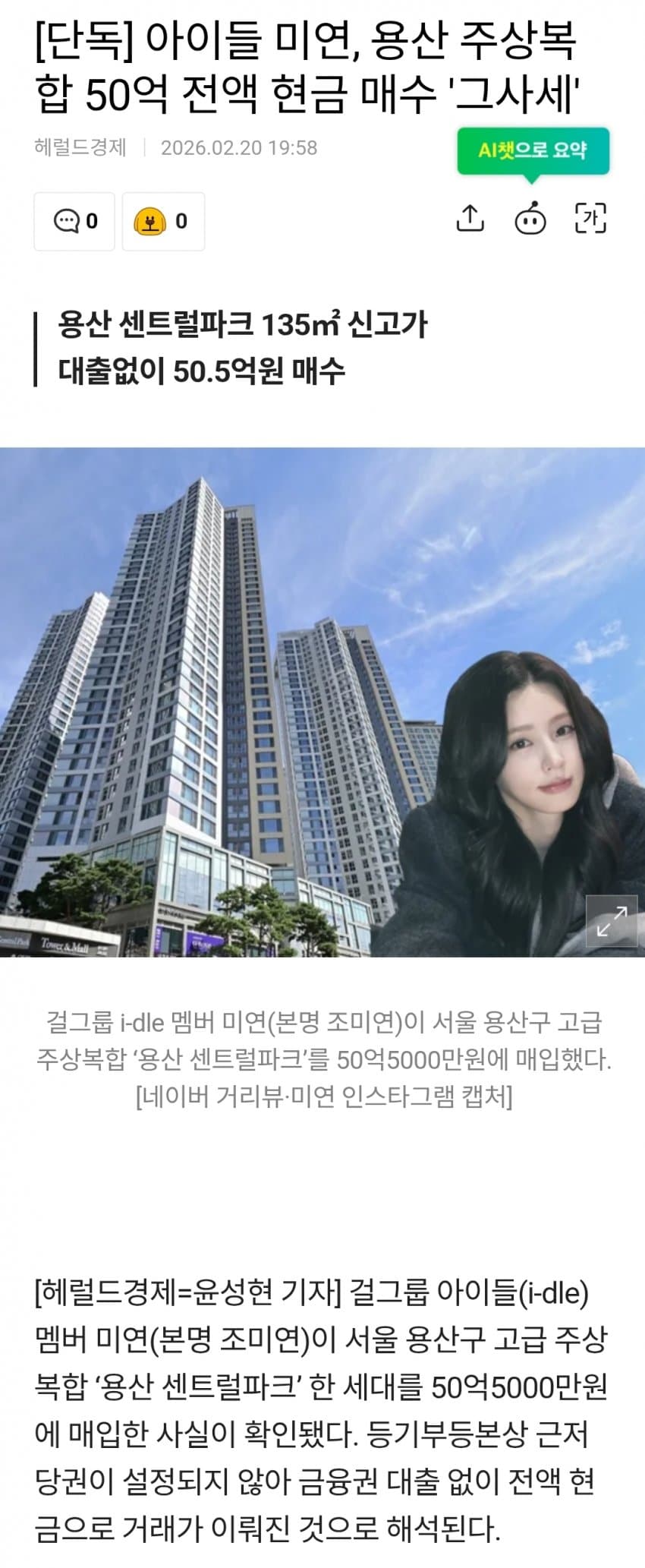 아이들 미연 용산 센트럴파크 주상복합 40평대 대출 없이 50.5억 매수 논란