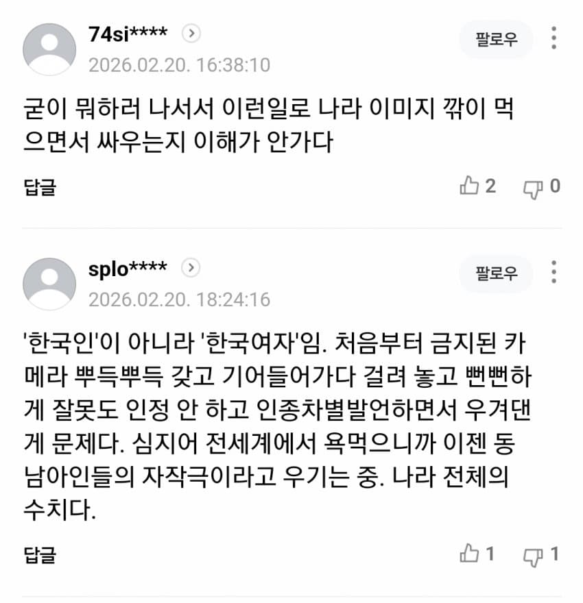 전세계가 한국 여자들의 표독함을 알게 되어 기쁘다.국내에서 남성혐오ㆍ인종차별 해도 그냥 봐주니까 외국에서도 통할 줄 알았나?한국여성들은 대부분 페미니스트들이고 남성혐오자들이고 인종차별주의자들이고 성차별주의자들이다