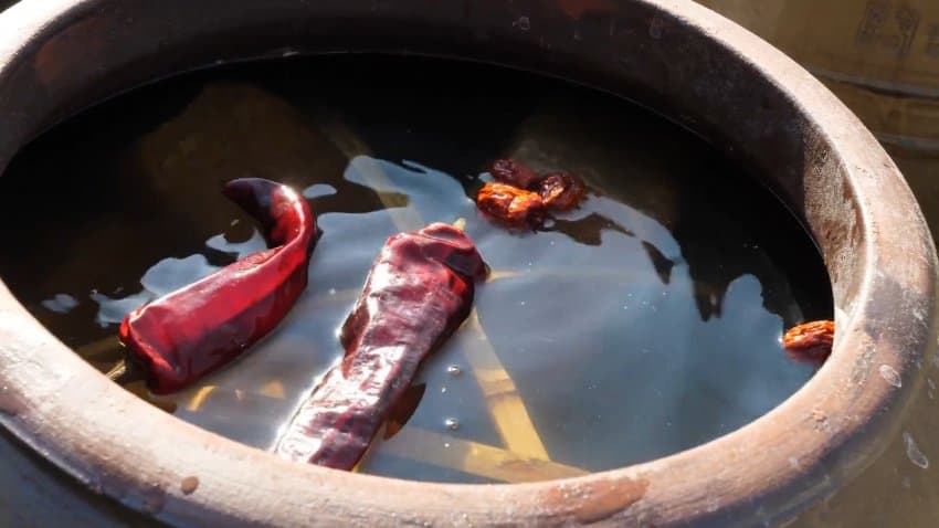 완성된 메주들은 깨끗하게 세척한 뒤 장독대에 깨끗한 물과 함께 담긴 뒤 떠오르지 않게 대나무 살로 고정