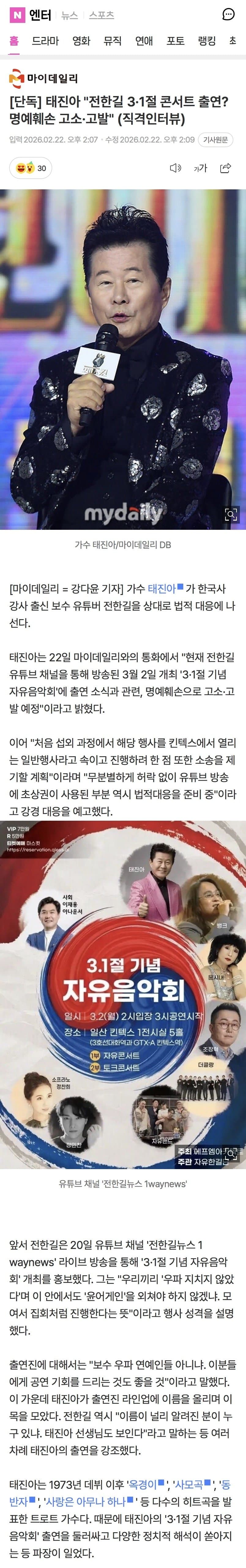 [단독] 태진아 "전한길 3·1절 콘서트 출연? 명예훼손 고소·고발"