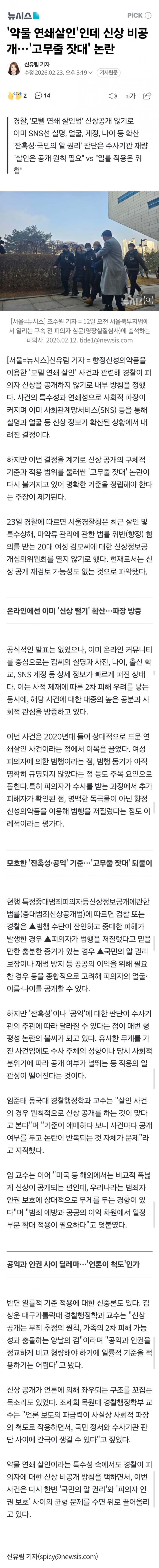 고유정도 원래 경찰에서 신상공개 안하기로 했었음.그런데 어떤 기자가 경찰서(?)에 몰카를 설치해서 고유정 얼굴 찍어서 특종으로 공개해버림.이렇게 고유정 신상이 언론 전체에 공개된 후 경찰도 어쩔 수 없이 신상공개 함