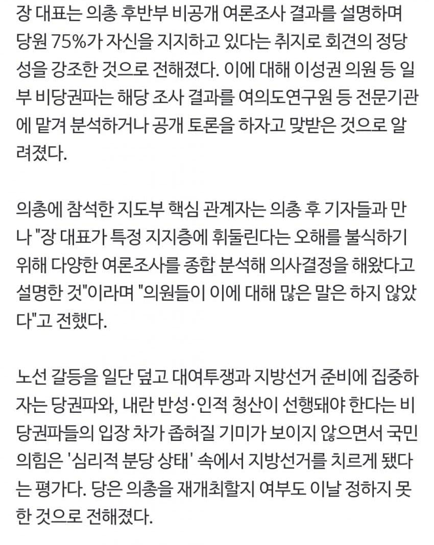 소장파 모임 '대안과미래' 간사인 이성권 의원은 당 지도부에 '윤 어게인'에 대한 국민 여론조사를 제안했다고 밝혔는데, 이에 장 대표는 비공개 여론조사 결과를 제시하며 "윤석열 전 대통령 1심 선고에 대해 당원 75%가 내 입장을 지지한다"는 취지로 답한 것으로 전해집니다.