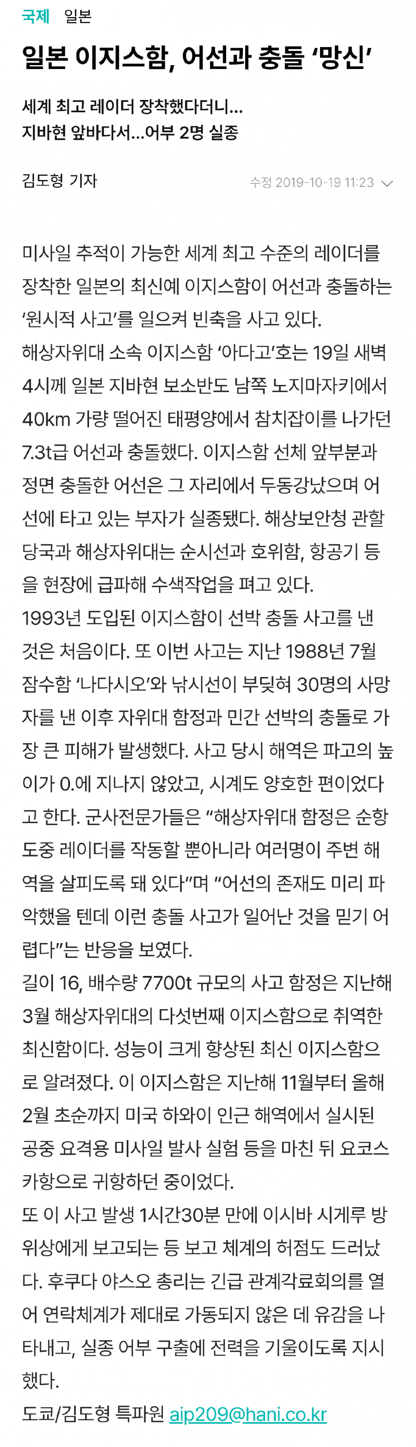 참고로 이지스함이 들이받은 어선에 타고 있던 두 명은 시신도 못찾음