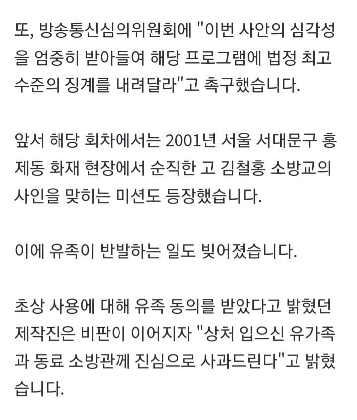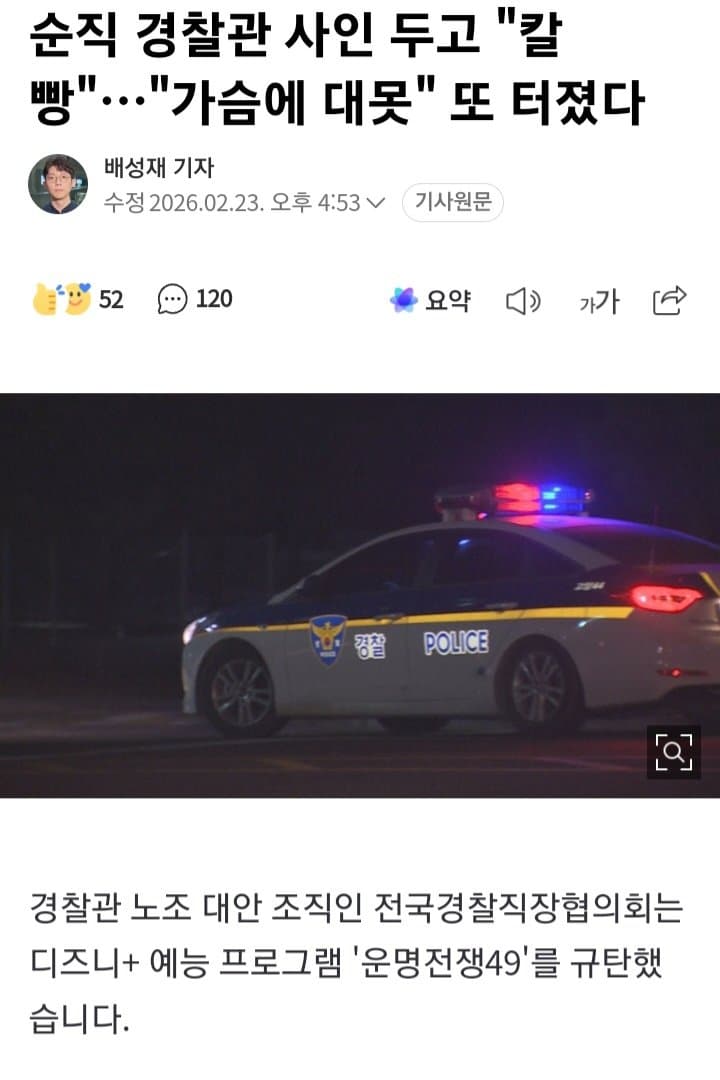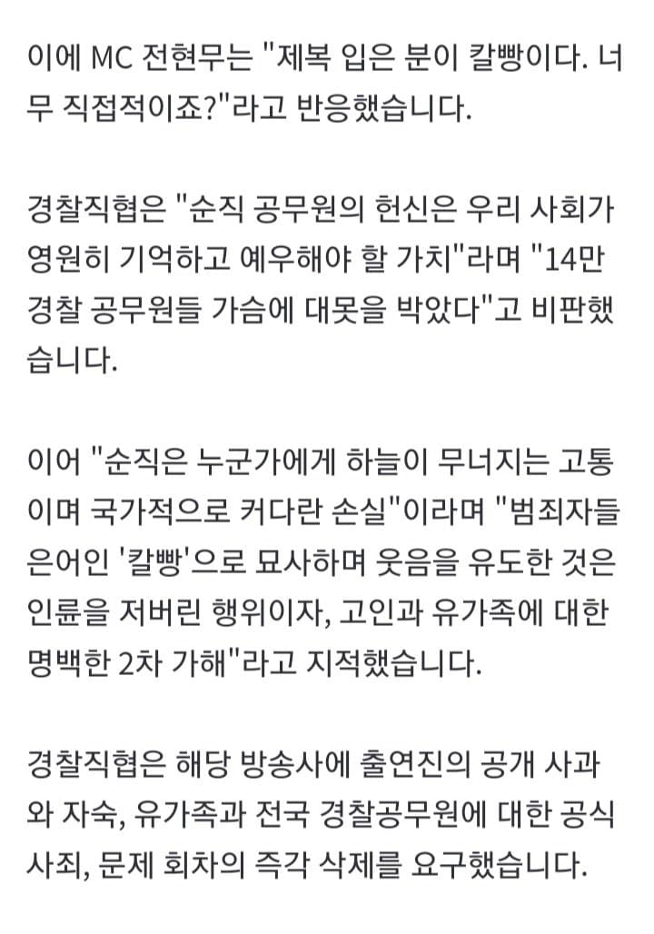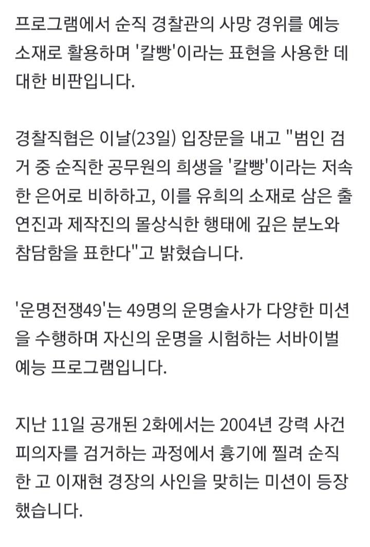 칼 보면 런치는 견찰들 많은 시대에 ㅅㅂ 싸우다 순직하신 분들로 저딴 예능을 찍으면 그나마 있던 참경찰들도 다 돌아서겠네