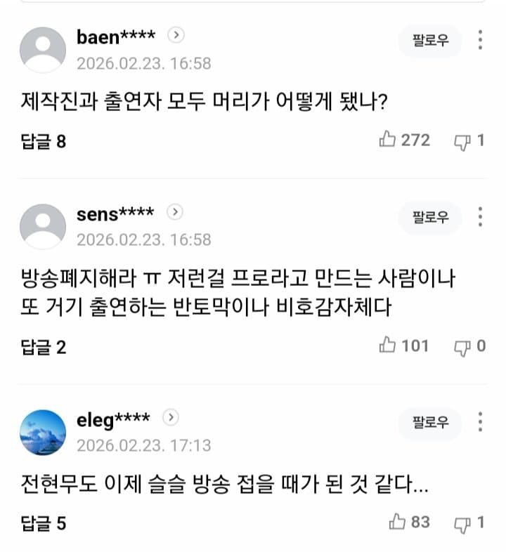 전현무 < 얘도 하는짓 보면 너무 비호감임 그리고 진지하게 박나래보다 재미없는 인간인데 자꾸 나오는 이유를 모르겠음 방송국 카르텔이 대한민국 카르텔 no.1인듯 노나먹고 돌려먹고 ㅋㅋㅋㅋ