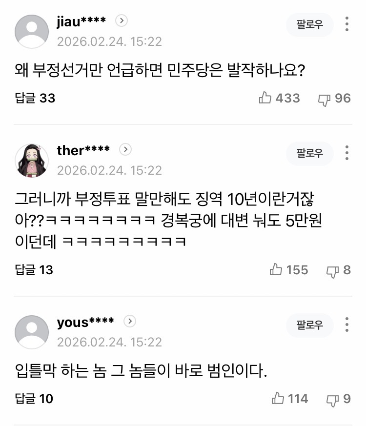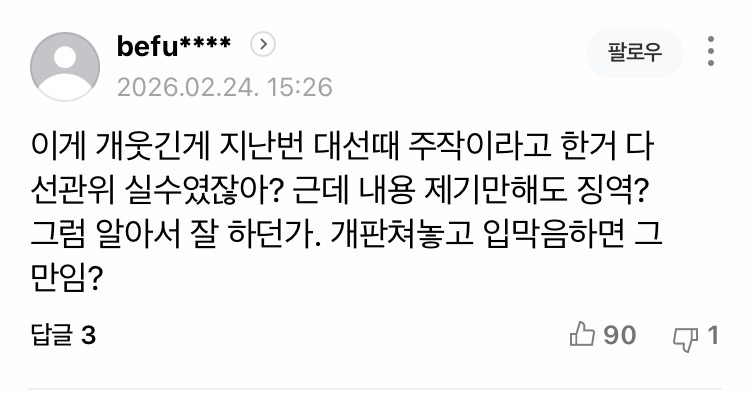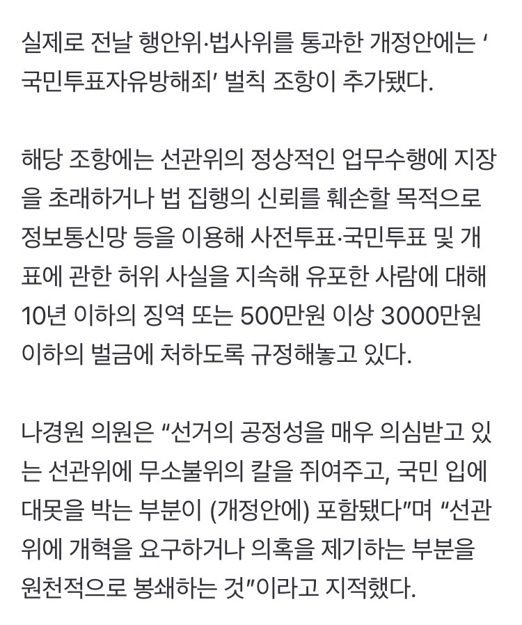 그러니까 선관위 비판만해도 10년 징역이란 소리군 개쌍도쌍깨 무능비리살인난쟁이 개재명스럽긴하네