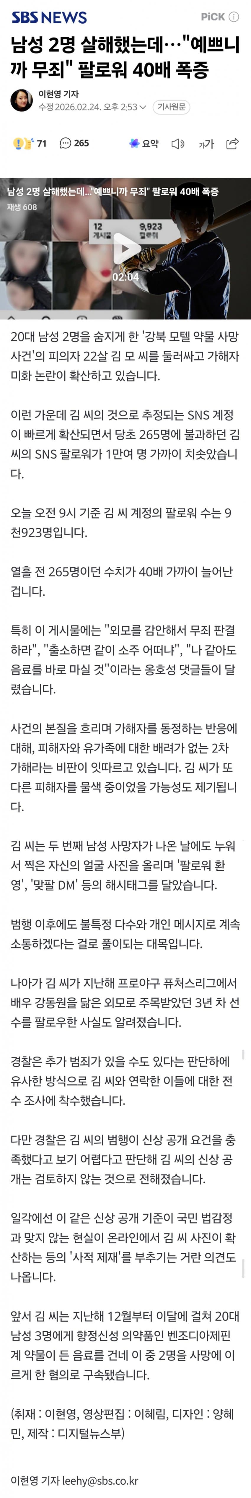피해자의 스토리텔링이 슬퍼야 피해자에 공감하는데 이 사건은 뭐랄까 그러게 조심좀하지 이런느낌으로 피해자들한테 감정이 가는게 많은듯