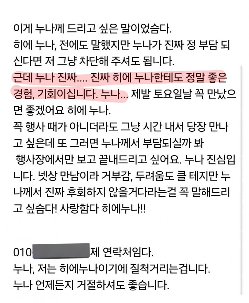 "누나 진짜...누나에게도 좋은 경험, 기회이십니다"