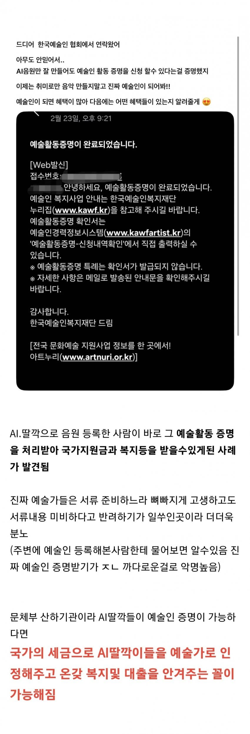 예술인복지재단은 한 번 신청하면 비공개 심의위원단(십수년동안 명단조차 공개된 적 없음)이 무려 ‘4개월’동안 검토한 다음 공연 사진, 영수증 사진 하나 없다고, 서류 없다고 인정 안하거나 개억지법으로 패악질부리면서 반려하는 곳임. AI 굴려서 만들었다고 인정받았단 건 구라일 확률이 매우 높음.
