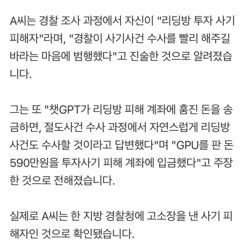 gpt가 똑똑하긴 뭐가 똑똑해 해당 계좌에 gpu구매 대금 내역만 조사하고 끝이지 어차피 영장도 건별로 신청해야 하는거라 계좌 조사해서 리딩방 관련한 내용이 나와도 그냥 버릴거임 ㅋㅋㅋㅋㅋㅋㅋㅋㅋ 영장 범위내가 아니거든 ㅋㅋㅋㅋㅋㅋ