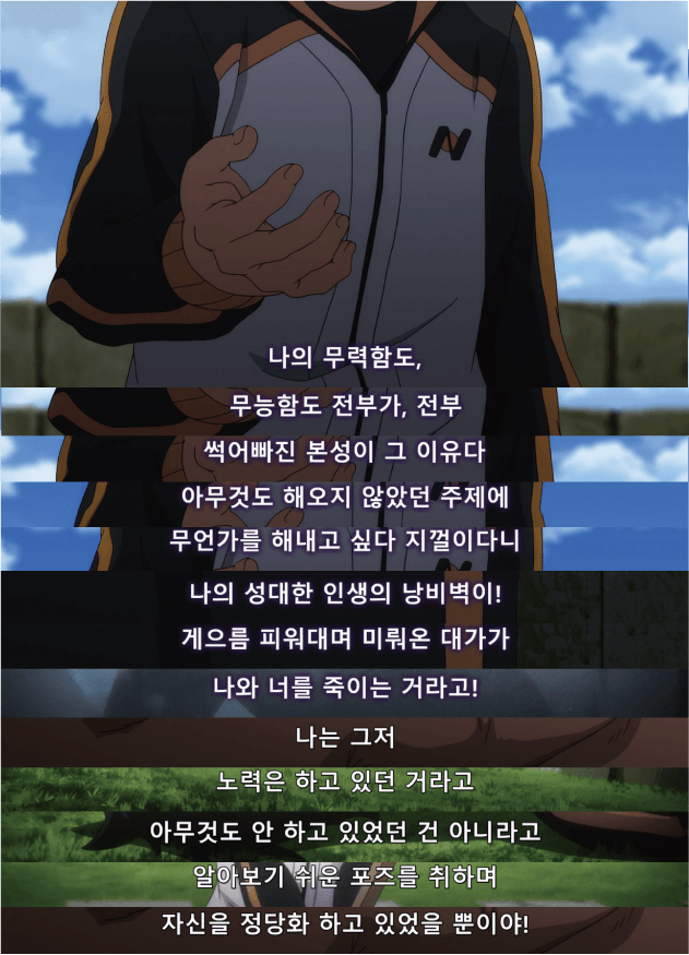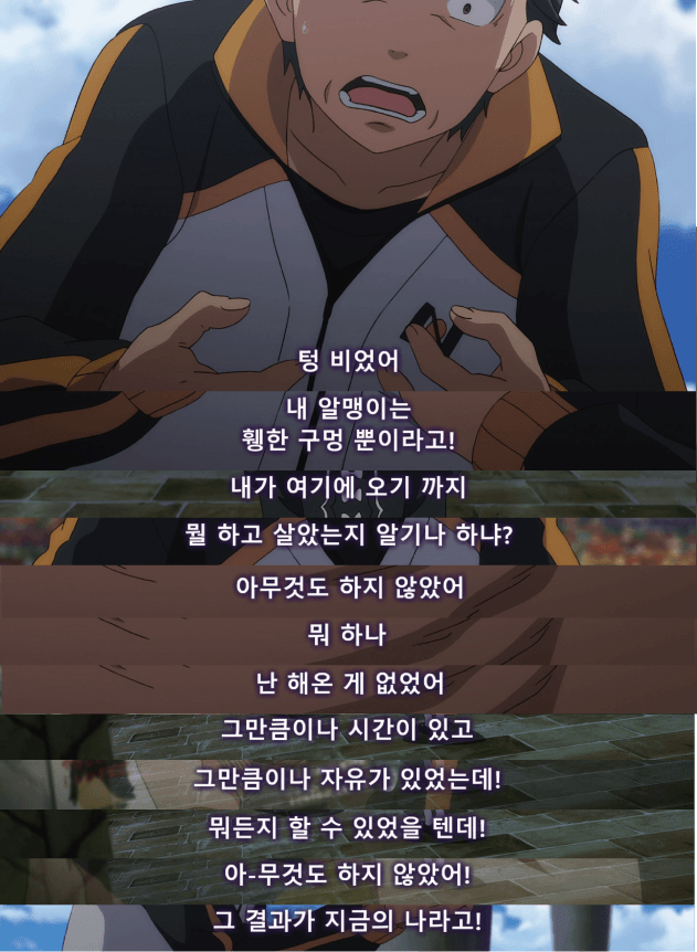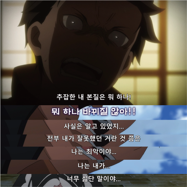 "렘은 스바루 군을 사랑하고 있어요."텅 비었고 아무것도 없는 자신을 용서할 수 없다면 ㅡ지금 여기서부터 시작하죠.렘의 멈춰있던 시간을 스바루 군이 움직여 준 것처럼 스바루 군의 멈춰있던 시간을 지금 움직이는 거예요.여기서부터 시작하죠. 하나부터.... 아뇨 제로부터!