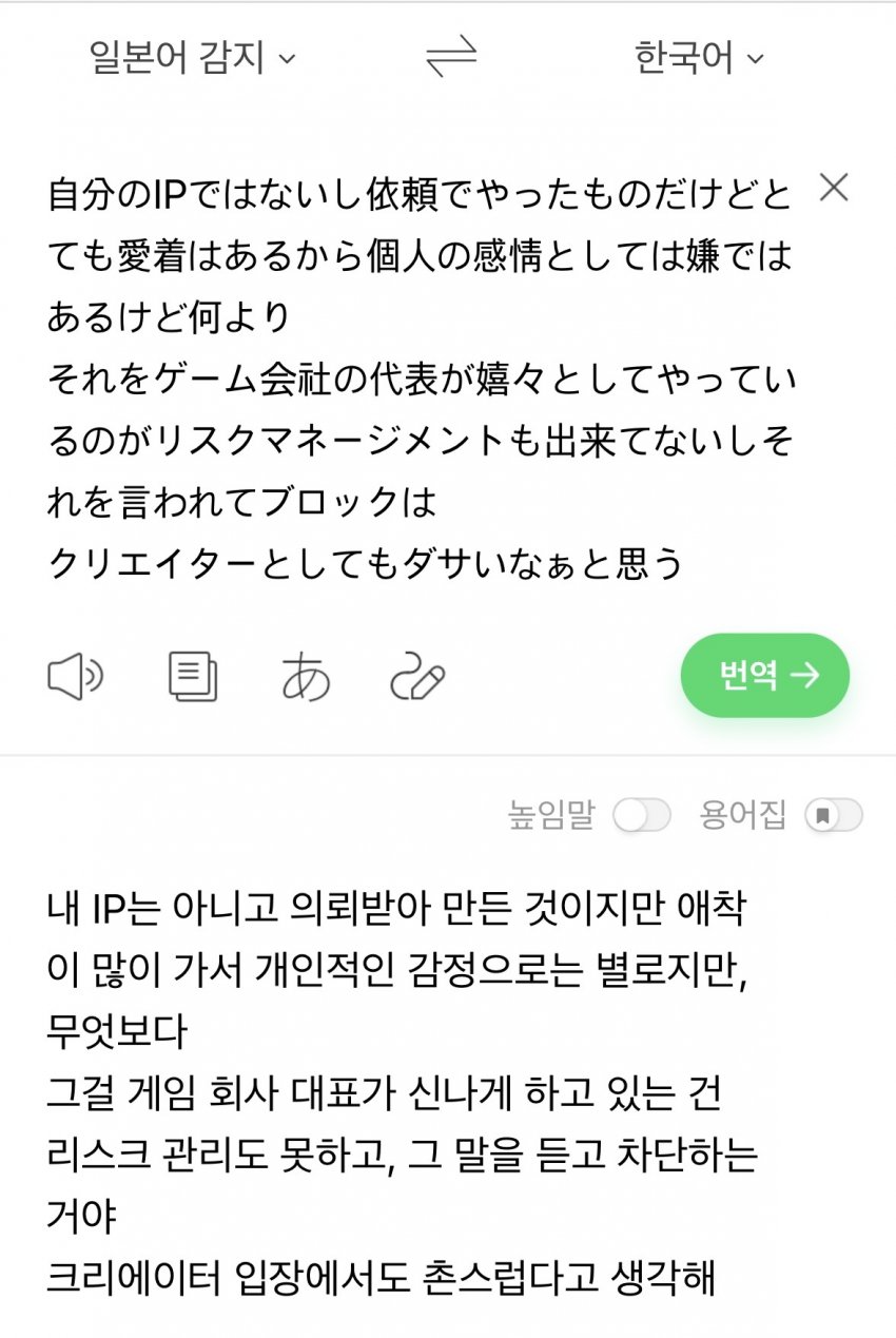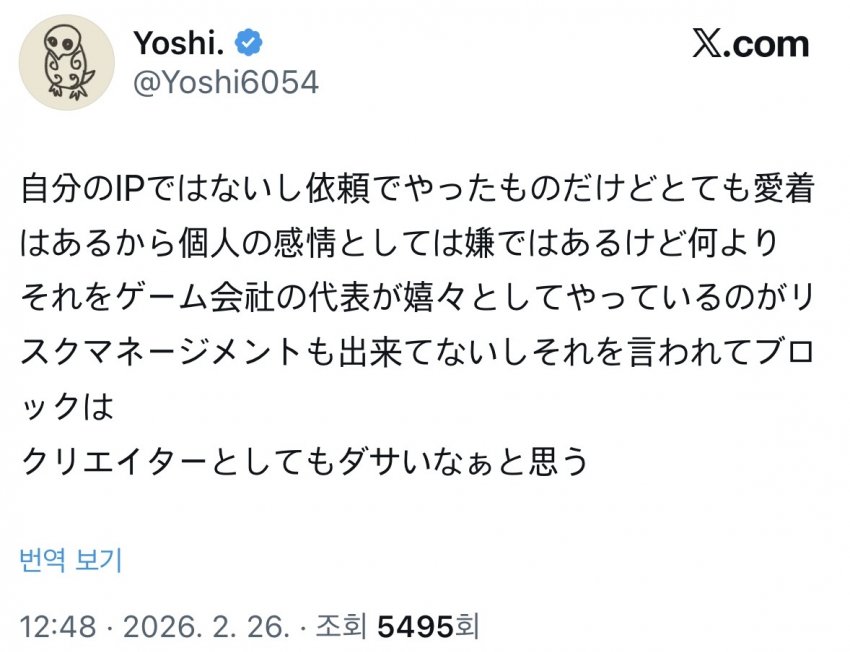 김형태가 딸깍해서 화제라도 된 수준의 완성도인데, 본인도 그걸 아는지 AI 그림이라는 형식적인 해시태그조차도 달지 않았음. 게임회사 대표란 인간이 저따위로 학습시켜서 올린다는건, 그냥 니케나 스텔라블레이드도 리소스 뜯어서 죄다 학습시키고 김형태나 꾸엠이나 할 것 없이 그 사람들 그림 죄다 학습돌려도 된다고 시인하는 꼴이나 다름없음. 지 얼굴에 침뱉은거지 이게 회사 대표가 할 짓이냐