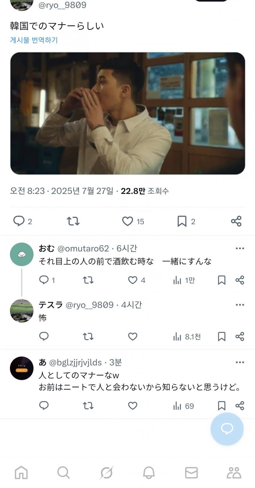 한국인은 저렇게 마시는게 아니라 술자리에 윗사람이 있을때 얼굴을 돌리고 마시는거 아님? 대체시발 어디서 온 매너인데 저건