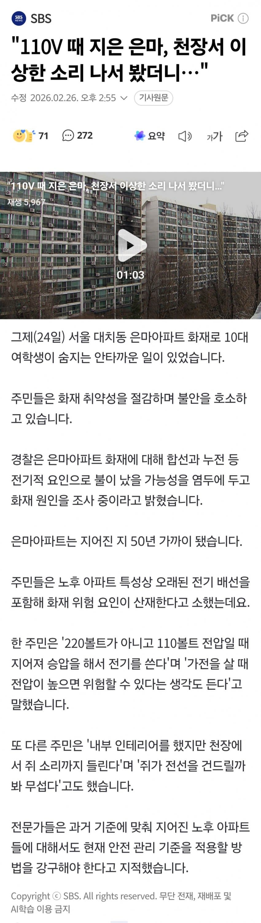 "110V 때 지은 은마아파트, 천장서 이상한 소리 나서 봤더니…"