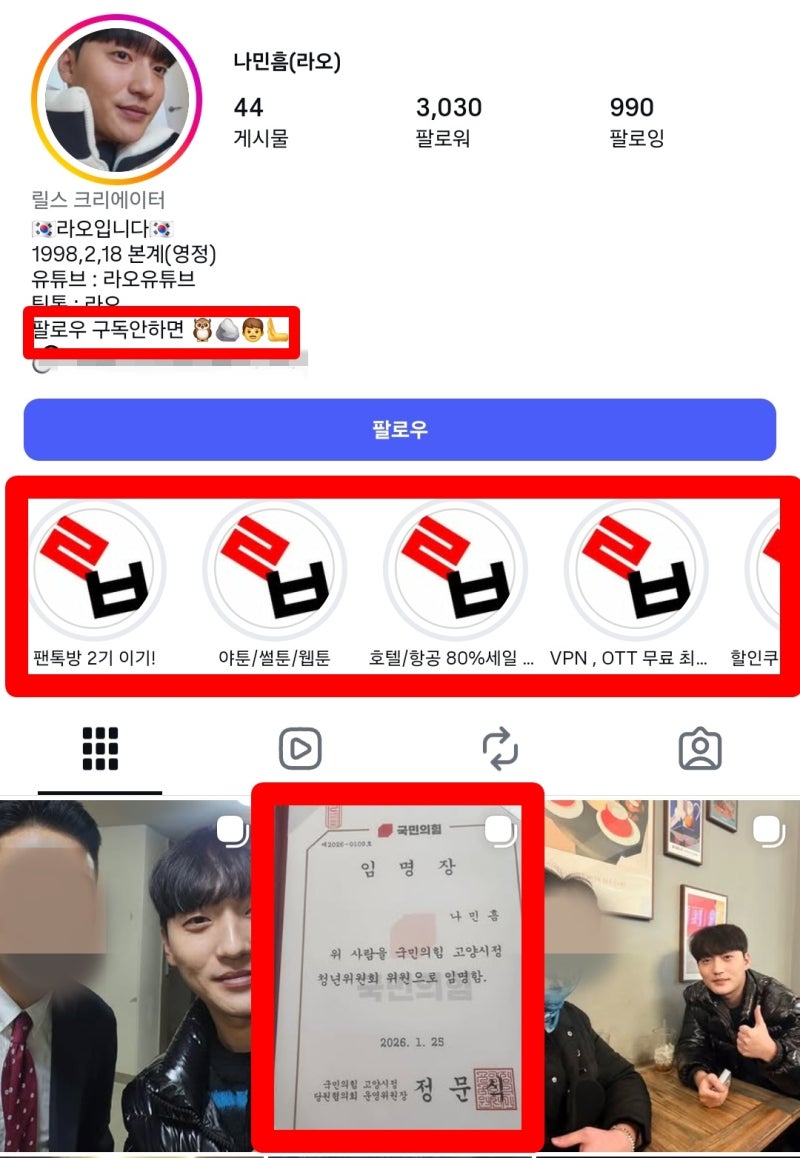 그러던 중 나씨는 지난 10일, 자신의 인스타그램에 "국민의힘 고양시 정 청년위원회 위원으로 임명함"이라는 문구가 담긴 국민의힘 임명장 사진을 게재했다. 정문식 국민의힘 고양시정 당협위원장의 직인이 날인된 이 임명장은 1월 25일에 발행됐다.