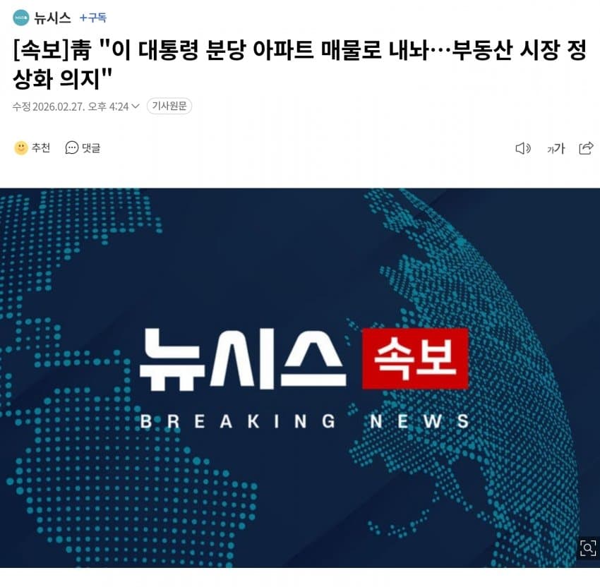 []靑 "이 대통령 분당 아파트 매물로 내놔, 29억에 계약 체결