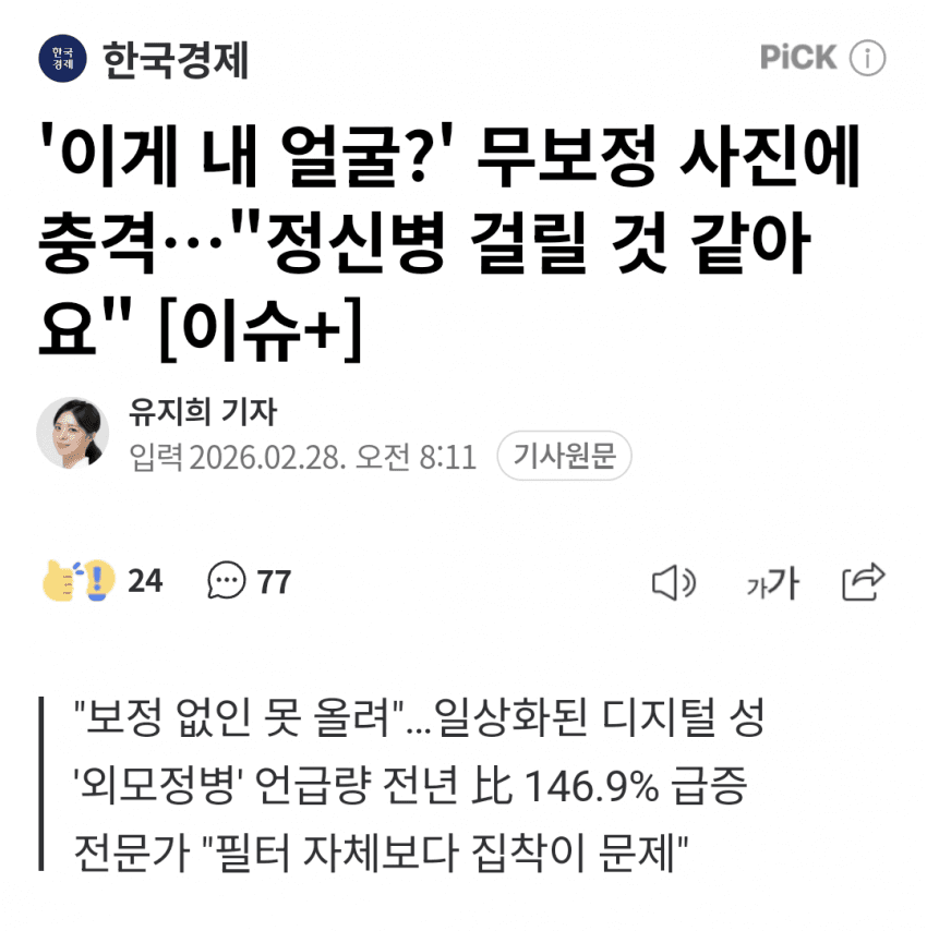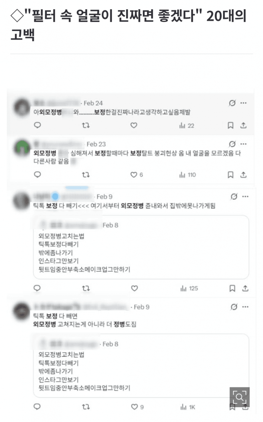 이미 대한민국부터가 외모 = 절대적 가치로 여기고 있는데 정신병 안걸리게 생겼음? 못생김 = 살 가치가 없음 수준으로 여기고 있는데 정신병 안걸리겠냐고. 못생겨도 괜찮아가 아니라, 이쁘거나 잘생기지 못하면 행복 할 자격도 없다고 생각하는게 대한민국 사람들임