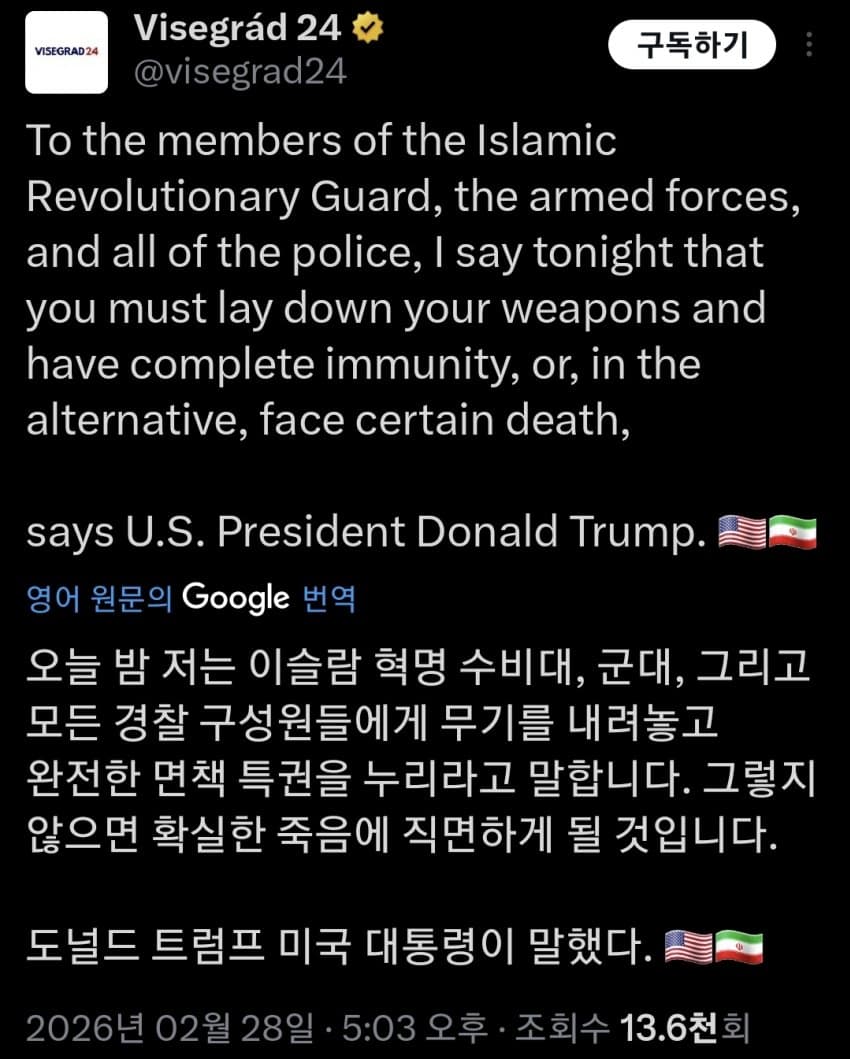 1979년 이래로 중동 패권이 미국 손에 고스란히 들어온 것은 전례가 없었다고 봐도 과언이 아닙니다소련이 망한 직후에도 이란의 하메네이 정권은 건재했으니까요이는 세계사적 분수령입니다이란이 무너진 건 기존 체제의 완전한 붕괴이며 미국 일극체제로의 전환을 뜻합니다지금까지는 소련이 무너졌지만 냉전 체제의 연장선상이었다면 이제는 완전한 미국 일극체제로 바뀌는 겁니다하메네이 사망은 마두로 생포와 비교할 수 없는 충격을 가져다 줄 것이며실제로 많은 전 세계의 좌파정권에서도 메세지를 훨씬 온건하게 가다듬고 있는 상황입니다