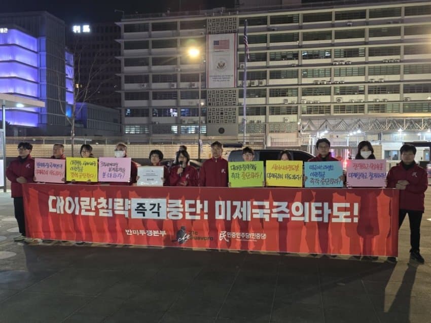 좀 웃기네ㅋㅋ 어딜 보고 시위하는 걸까? 도둑놈 눈앞에 있는데 뒤돌아서 항의하는 거 같네 한국에서 한글로 항의하면 대체 무슨 의미가.