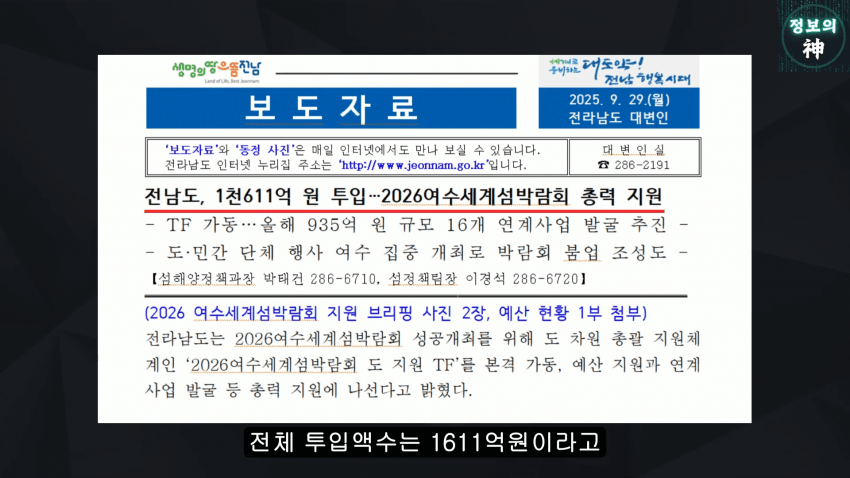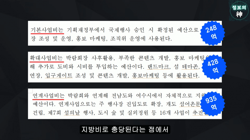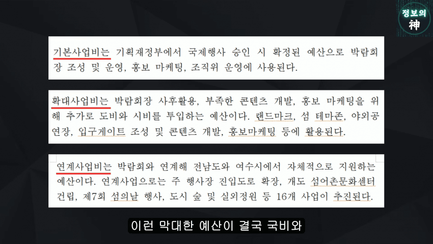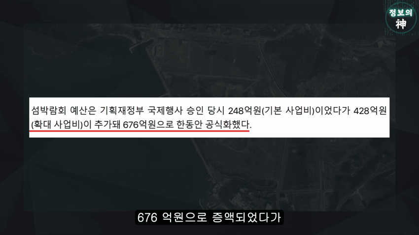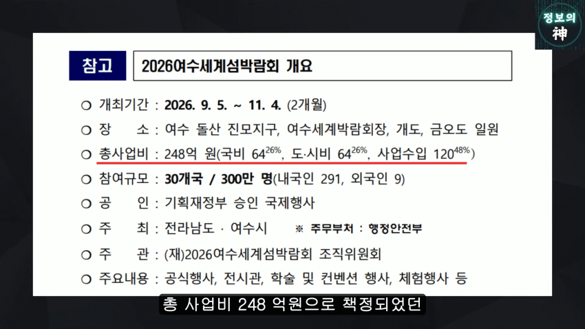 저 섬박람회가 얼마나 시x스럽냐면 악명높은 잼버리로 쓴 예산이 1천억임 근데 1천억 한번 해먹어보니깐 묻고 떠블로 가 해도 될거같다 생각한거지 그러니 저 박람회 하는데 1600억 넘게 쳐먹은건데 내가 볼땐 시간촉박한데 예산부족하다 땡깡질해서 400억 받아내 2천억 채울거 같긴 함ㅋㅋ 저거 성공하면 다음번엔 3천억짜리 프로젝트 하나 또 만들듯ㅋㅋ