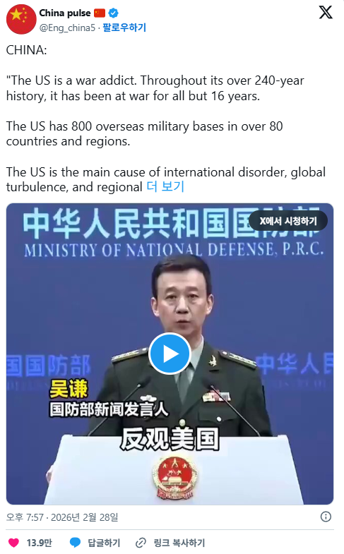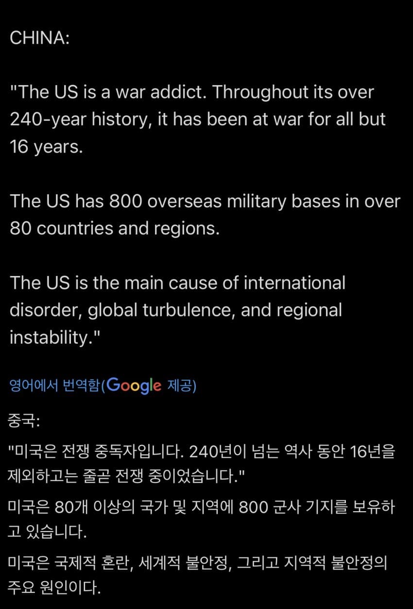 중국은 자국민 상대로 전쟁해서 1억명 죽이고 미국은 외국인 상대로 전쟁하는 나라고
