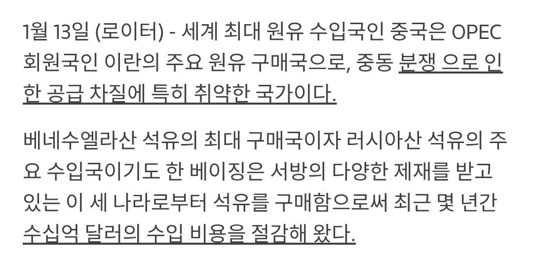 ㅇㅇ미국이 베네 이란치는 이유는 중국으로의 석유유입 차단임, 또 그 배경엔 중국의 대만침략을 저지하기위한 방안임침략하려면 석유가 있어야 하니까, 물론 비축분이 있지만 대만침공을 그만큼 연기 또는 하더라도 오래끌지 못하게 하기위함